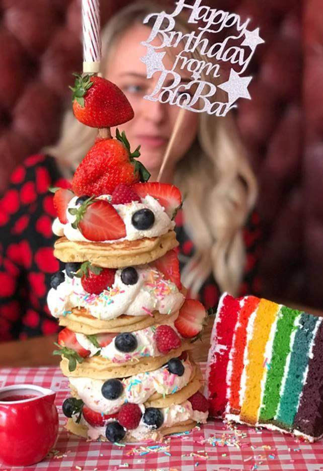 Celebrate in style with our famed Birthday tower. Five fluffy vanilla pancakes piled high with whipped vanilla cream, fresh fruit, topped with sprinkles, a fizzy sparkler and complete with a slice of fresh Birthday cake on the side. £15