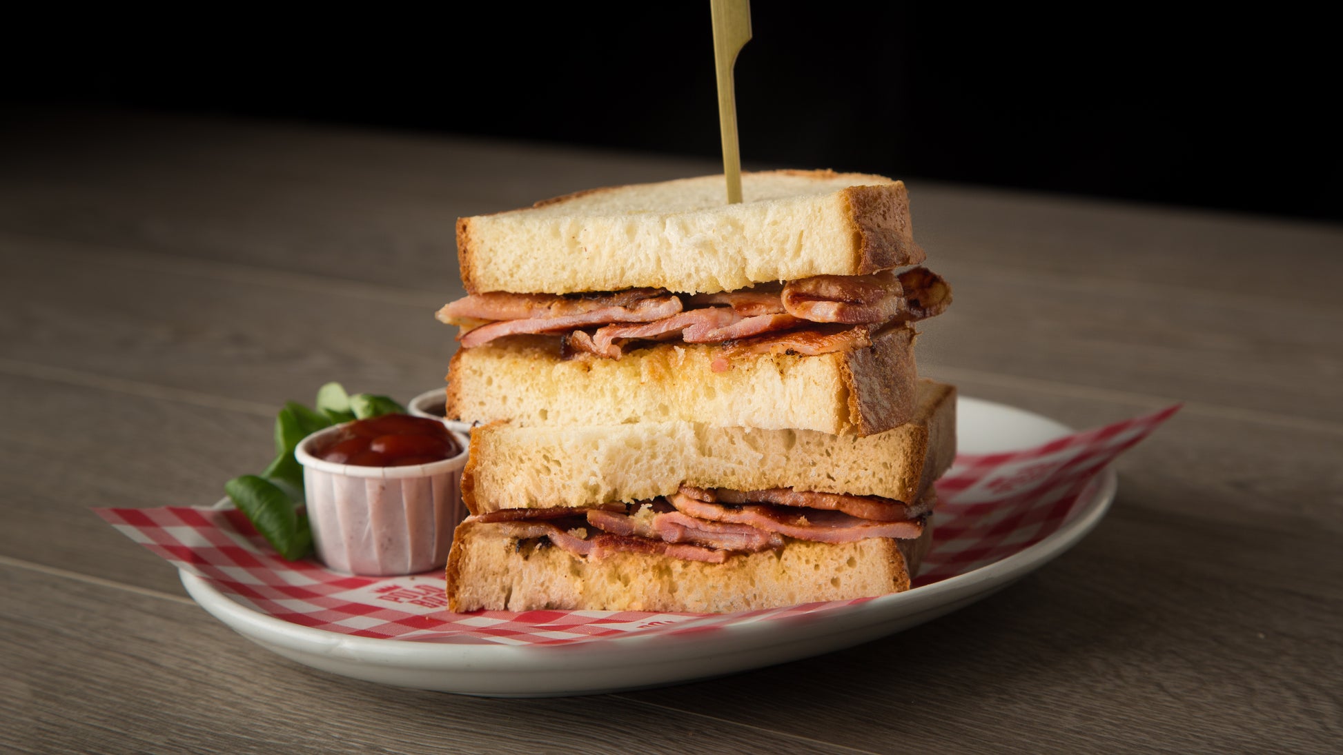 Freshly grilled bacon served in freshly sliced bloomer bread.