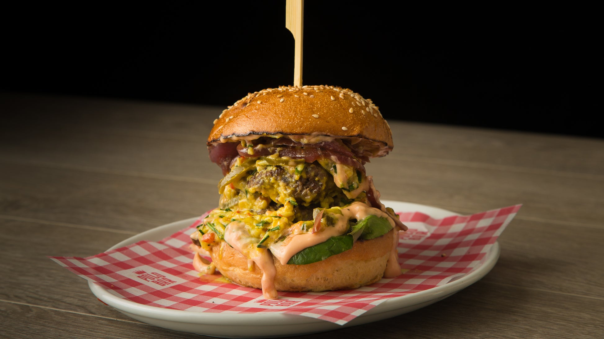 2 homemade steak burgers, with chilli cheese, sesame brioche bun, BBQ mayo, homemade caramelised red onions.